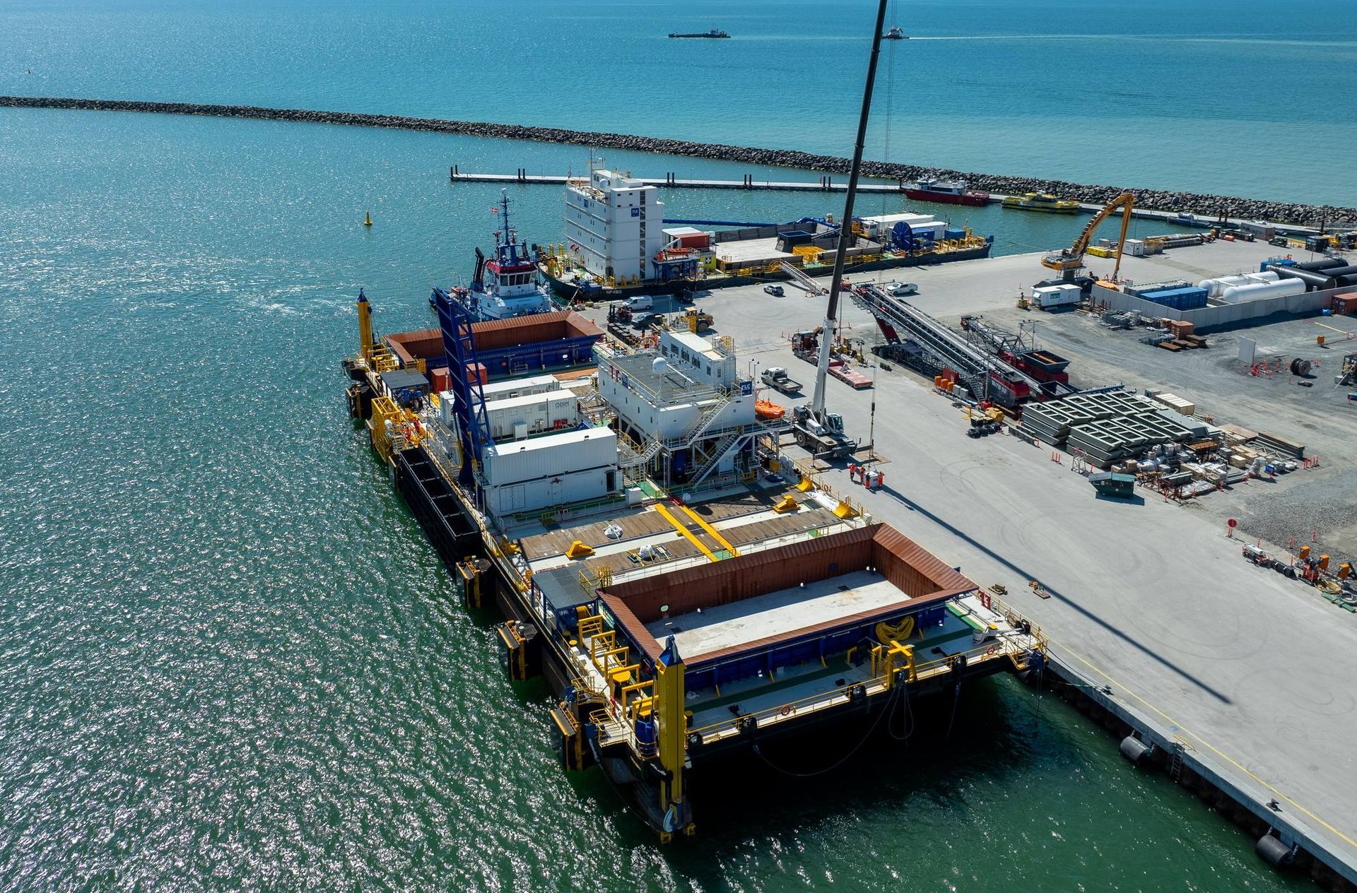 Spreader pontoonButtonPontoon for the Fehmarnbelt Fixed Link, purposed designed for stabilizing tunnel segments with sand.